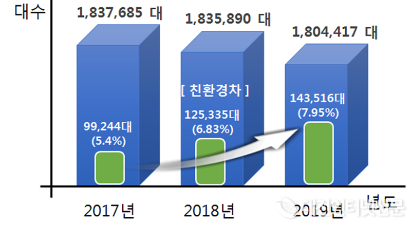 친환경자동차(전기, 수소, 하이브리드)는 총 60만 1,048대로 전체에서 차지하는 비중이 2018년 2.0%에서 지난해 2.5%로 늘어나 친환경차의 점유율이 점차 증가하고 있음을 보여주고 있다.