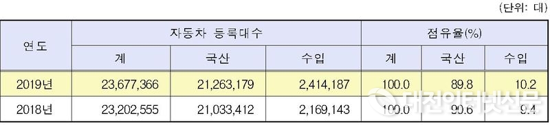 2019년 자동차 신규 등록대수는 181만 1,000대로 2018년 184만 3,000대 보다 3만1,081대가 감소했다. 신규등록 중 국산차는 153만 8,000대에서 152만 4,000대로, 수입차는 29만 7,000대에서 28만대로 각각 감소했다.