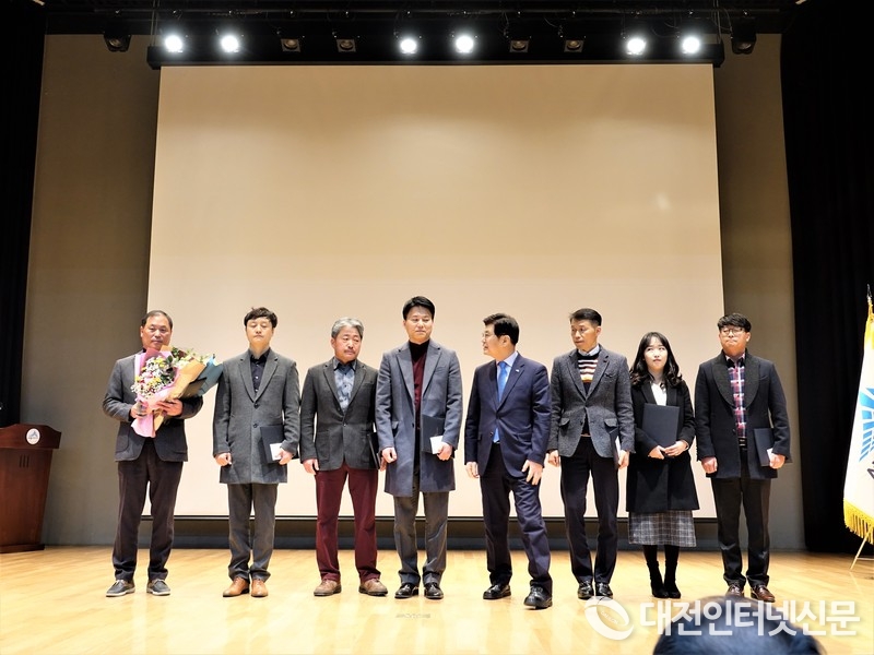 이춘희 시장이 근무혁신 우수기관과 스마트한 시정만들기 공모전에 입상한 수상자들에게 상장과 포상금을 수여하고 특히 화재진압의 장한시민 장성진씨에게 유공자 표창을 수여했다.(사진-대전인터넷신문)