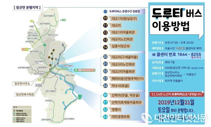 수요응답형(DRT) ‘두루타’ 버스노선은 장군면사무소와 장군면 복지회관을 출발하며 ▲첫 번째로 대교1리 마을회관과 노인회관을 거쳐 김종서 장군 묘까지, ▲두 번째로 대교2리 마을회관과 해피타운을 거쳐 약수사(독 골)까지, ▲세 번째로 산학리(큰골, 작은골)를 거쳐 효재동 마을회관과 영평사를 거친 후 대전공원묘원까지 가는 세 개의 지역을 중심으로 운행되고 있다.