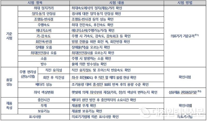 이에 식약처와 한국소비자원은 객관적인 상품 품질 정보 제공 및 관련 기준 적합성 확인을 위해 장애인과 고령자들이 많이 사용하는 전동휠체어 6개 업체의 6개 제품을 대상으로 안전성과 주행 편리성, 배터리 성능 등의 품질성능 및 제품특성을 시험‧평가하였다고 밝히며 시험결과, 장애물 오름, 경사로에서의 안정성, 최대속도 등의 안전성은 모든 제품이 기준에 적합한 것으로 나타났다고 말했다.