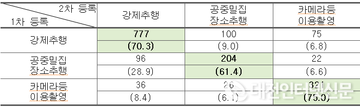 범죄 유형에서는 ‘카메라 등 이용 촬영죄’의 동일 재범비율이 75.0%로 가장 높았고, ‘강제추행’ 70.3%, ‘공중밀집 장소 추행’ 61.4%로 여타 범죄와 비교해 1・2차 등록 죄명의 일치율이 높은 것으로 나타났다.
