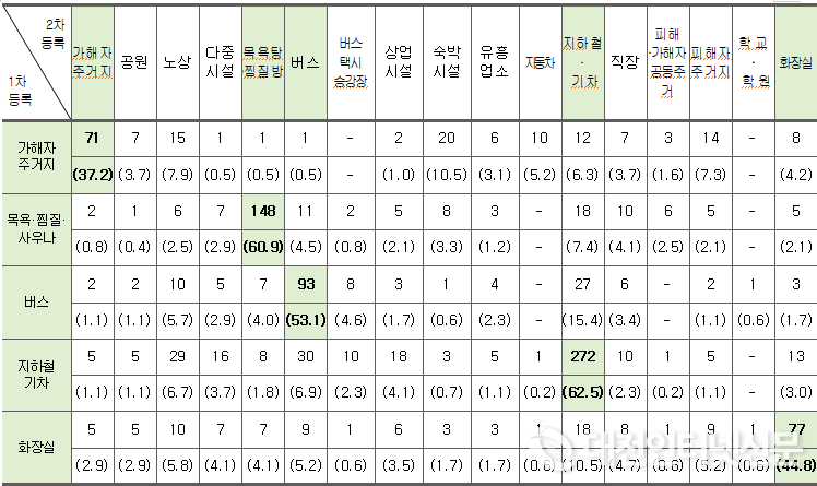 2020 성범죄백서에 따르면 성범죄 발생 장소와 관련하여, 지하철 또는 기차에서 성범죄를 범했던 자가 다시 지하철 또는 기차에서 성범죄를 저지른 경우가 62.5%로 가장 높았고, 목욕탕・찜질방・사우나 60.9%, 버스 53.1%, 공중화장실 44.8%, 범죄자의 주거지 37.2% 등 재범자(2,901명)의 36.5%(1,058명)가 원죄 명과 같은 장소를 범죄지로 선택한 것으로 나타났다.