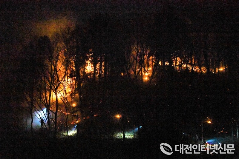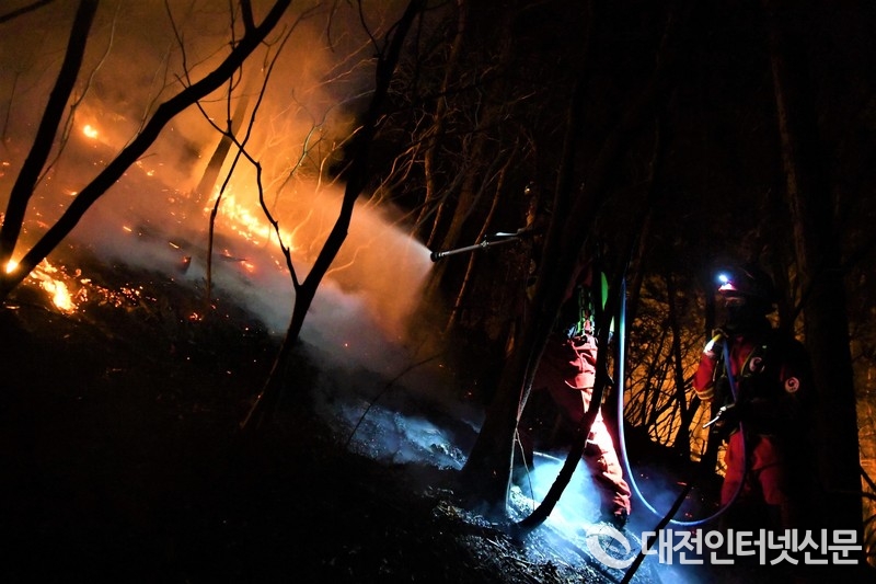 산림청 산림항공본부 공중진화대원들이 19일 울산시 울주군 웅촌면과 청량면 일대에서 산불 진화 야간 작업을 벌이고 있다.(사진=산림청 제공)