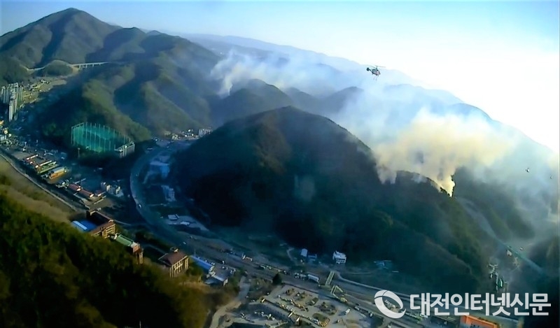 산림청은 산불 진화 헬기뿐 아니라 공중진화대원 등 진화인력 2천여 명과 산불 진화 장비를 동원하여 방화선을 구축하고 산불이 주택으로 넘어오지 못하도록 총력을 다했다.(사진-산림청)
