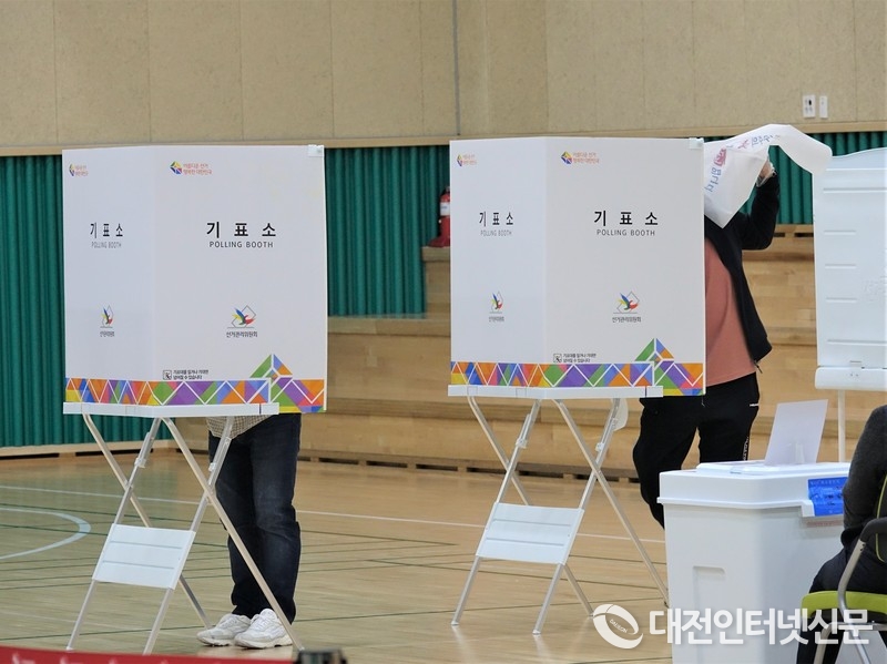 그 어느 때보다 차분하게 진행된 사전투표소에서 기표하는 유권자. [사진-대전인터넷신문]