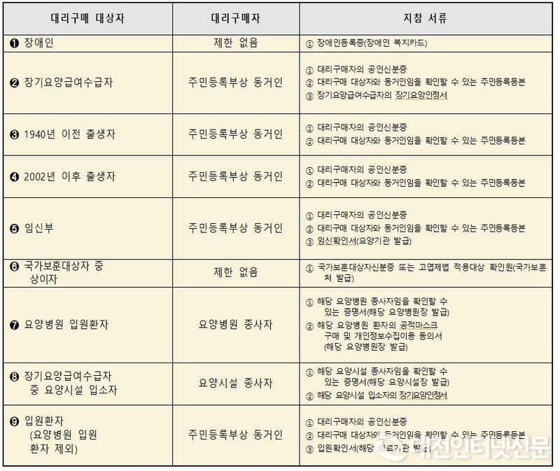 대리구매 대상자는 장애인, 장기요양 급여 수급자, 1940년 포함 그 이전 출생자, 2002년 포함 그 이후 출생자, 임신부, 국가보훈대상자 중 상이자, 요양병원 입원환자, 장기요양급여수급자 중 요양시설 입소자, 일반병원 입원환자이며, 대리구매 시에는 필요한 서류를 모두 갖추어 구매대상자의 출생연도에 맞춰 구매해야 한다.