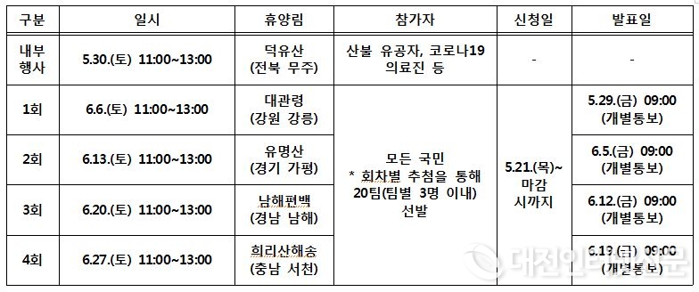 다만, 1회 차는 국가재난 상황 극복을 위해 힘쓰신 분들의 노고 치하 등을 위해 산불 진화 유공자, 코로나19 의료진 등을 대상으로 진행될 예정이라 참여를 원하는 분들은 2회 차부터 신청이 가능하다고 관계자는 말했다.