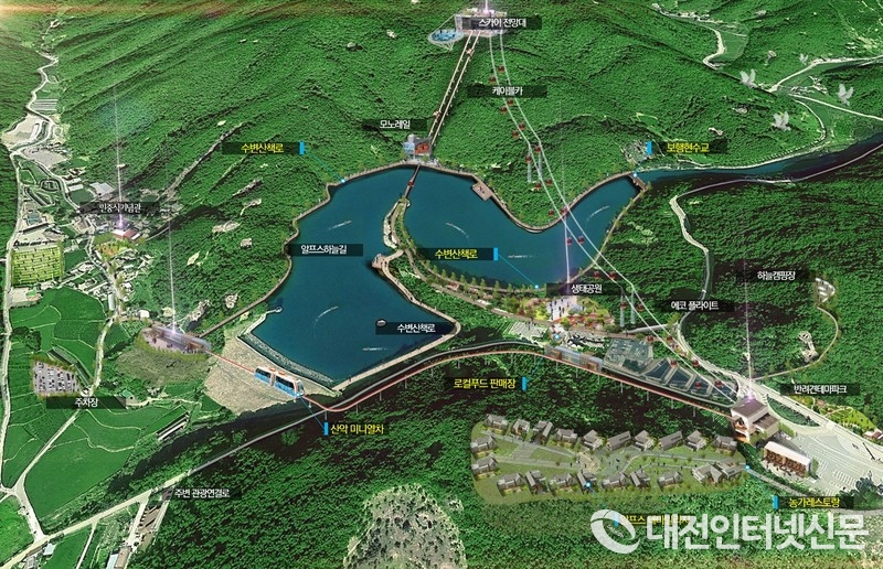 세부적으로 천장호 관광지 재활성화는 기존 사업인 천장 알프스지구 관광인프라 확충, 알프스로 가는 하늘길 조성사업과 연계하면서 알프스 테마 빌리지 및 수변 산책로 조성, 보행 현수교 설치, 로컬푸드 직판매장 설치, 모노레일과 산악열차 설치 등 ‘충남의 알프스’ 이미지를 구체화한다.