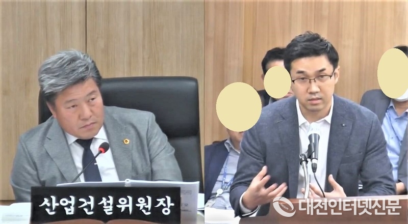 세종시의회 산업건설위원회 세종시 도로과 소관 행정사무 감사에서 세종시 민간전기자전거 기본요금 인상 관련 질의 나선 차성호 위원장과 거짓 답변으로 일관하는 세종시 도로과장. (사진-세종시 의회)