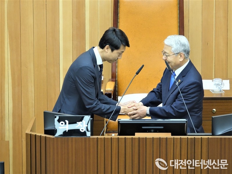 서금택 전 시의회 의장과 악수하는 이태환 신임 의장의 모습. (사진-대전인터넷신문)