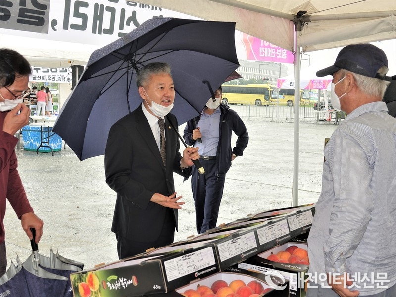 특히 빗속에 개최된 복숭아 판매전 첫날 방문객의 발길이 뜸해, 애태우던 농심을 홍성국 의원(세종 갑)이 판매장을 방문, 농민을 격려하고, 농가의 애로사항을 경청하며 힘을 실어줬다.