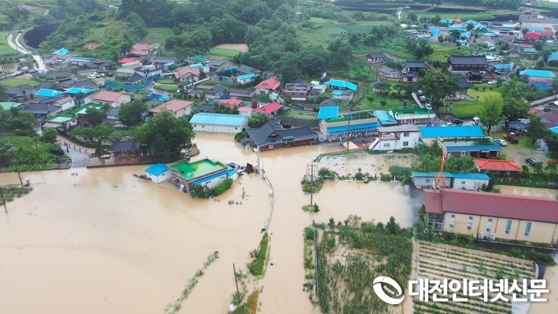 평소 방류량 대비 약 10배가량의 용담댐 방류로 농경지 471ha가 물에 잠기고 125가구가 침수, 233명의 주민이 임시대피한 금산군 수혜현장. [사진-금산군 제공]