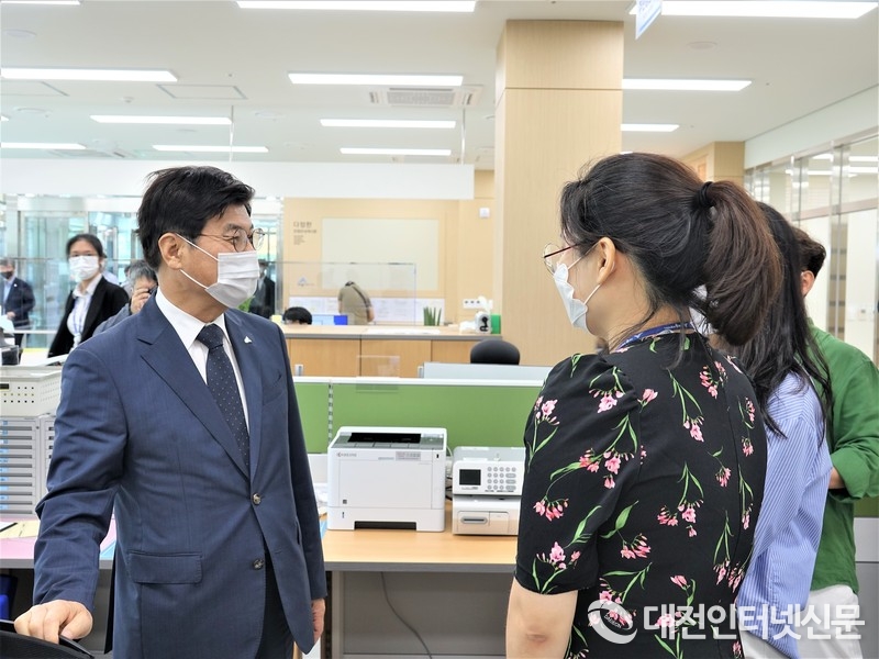 이춘희 시장이 개청식 직후 주민센터를 방문 직원들을 격려하고 환담하는 모습. [사진-대전인터넷신문]