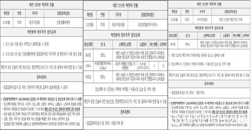 24일 확진된 대전 220번(70대 가양동) 확진자는 지난 22일과 23일 인동생활체육관 밀 접촉자로 자가격리 중 확진되었고, 대전 221번 확진자(50대 원내동)는 유성에 있는 ‘유성온천불가마사우나’에서 21일 20:30~23:00 사이 감염된 것으로 추정되며 가족 등 밀 접촉자 16명은 검사 및 격리 중인 것으로 확인되고 있다.