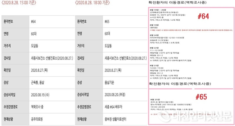 세종 64번 확진자는 지난 8월 19일부터 근육통, 몸살의 증상을 보였고, 세종 65번 확진자는 20일경 몸살 기운을 느끼던 중 2명 모두 27일 확진 판정을 받았다.