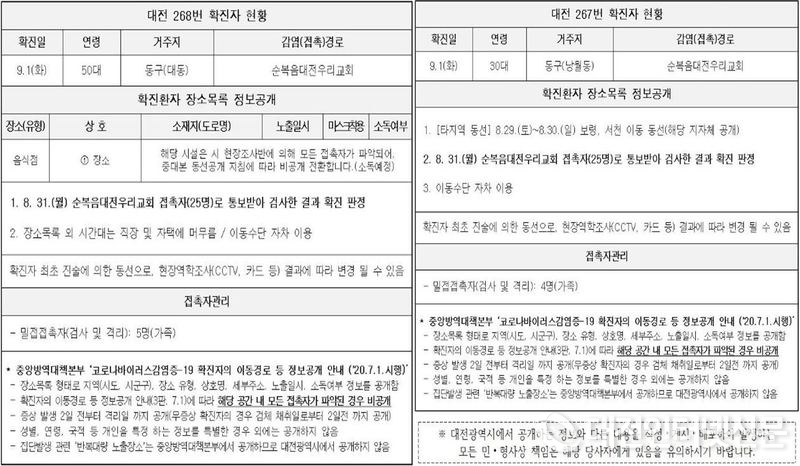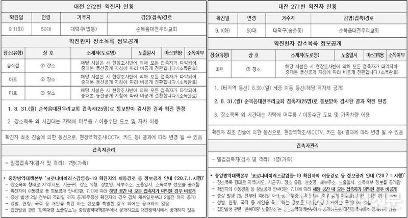 1일 확진 판정을 받은 서구 거주 20대(대전 275번)는 대전 264번 확진자와의 접촉으로, 유성구 거주 40대(대전 274번)는 대전 187번 확진자와 접촉으로, 대덕구 거주 60대(대전 273번)는 대전 263번 확진자의 가족으로 확인 되었고, 대전 265번~272번, 276번은 동구 소재 순복음 대전 우리교회에서 발생했다.