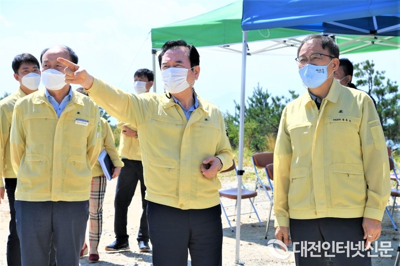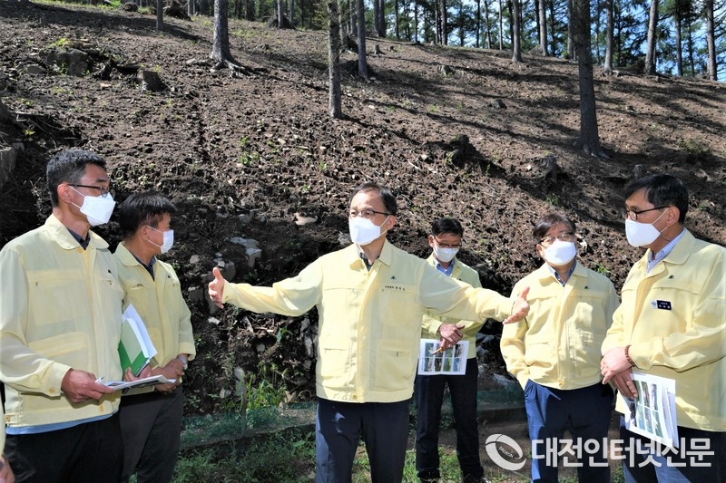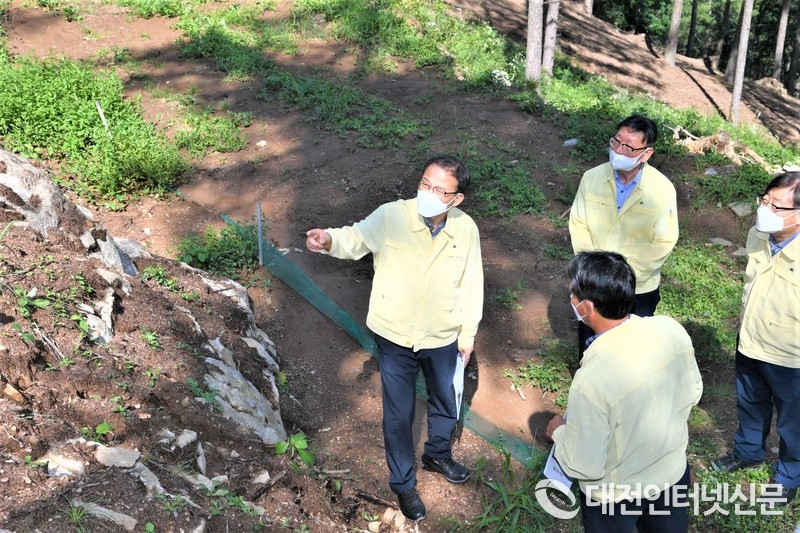 [대전인터넷신문=대전/박미서기자] 박종호 산림청장이 4일 경남 함양군 병곡면 산림유역관리사업장을 찾아 서춘수 함양군수와 제10호 태풍 '하이선'을 대비한 안전관리 상황을 점검하고 있다.