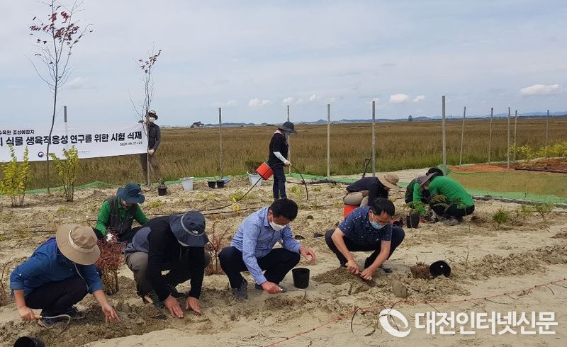 이는 산림청과 한국수목원관리원이 2019년부터 진행하고 있는 ‘새만금수목원 예정지 생육 적응성 및 생육 기반 연구’ 사업의 일환으로 새만금 간척지에서 식물 환경 적응성을 검증하기 위해 시험 연구부지에 조성된 식재 기반(약 5,400㎡)에 심은 것이다.