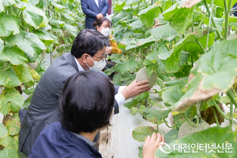 기능성 멜론 가바론의 착과상태를 살펴보는 김돈곤 군수의 모습(사진-청양군)