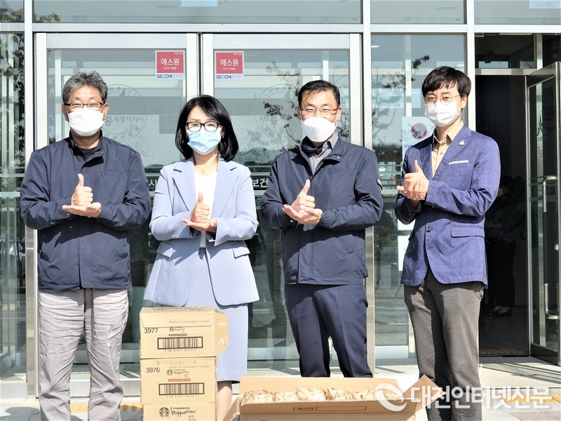 세종시 향토기업인 흥덕산업 김윤회 대표와 대림산업 김성환 소장 및 직원들이 밤낮 없는 코로나19에 지친 세종보건환경연구원을 방문 연구원들을 격려하고 함께 감사의 마음을 전하는 퍼포먼스를...[사진-대전인터넷신문]