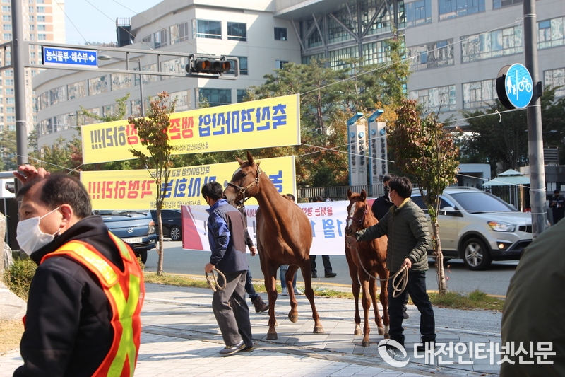 [대전인터넸신문=세종/권혁선 기자] 축산경마산업 비상대책위원회가 10월 19일 정부세종청사 농림축산식품부 앞에서 ‘온라인 마권발매’의 조속한 입법과 농림축산식품부장관·한국마사회장을 규탄하는 집회를 열었다.