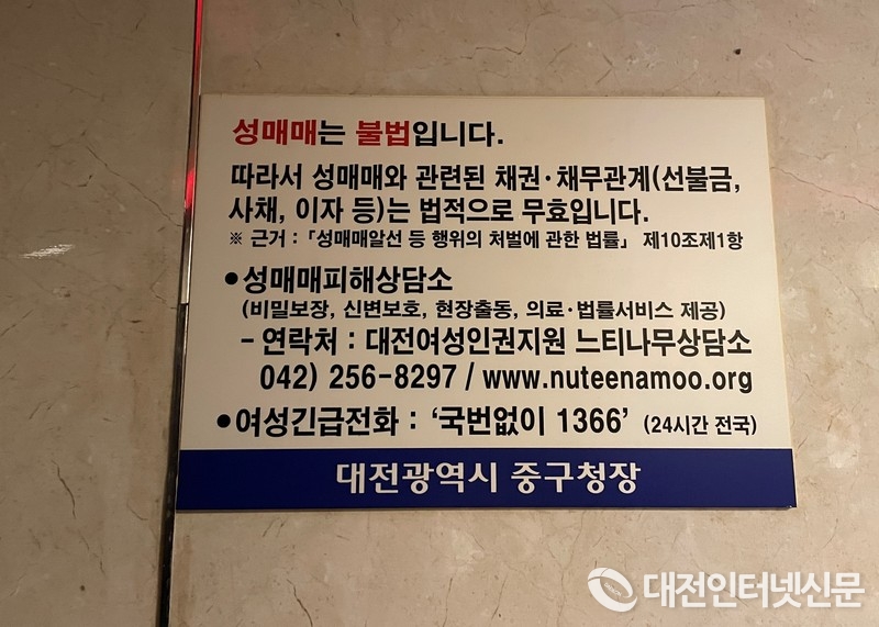[대전인터넷신문=대전/박미서기자] 대전 중구는 지난 24일 야간 관내 유흥주점을 대상으로 성매매방지 게시물 부착 여부 점검과 함께 코로나19 예방 안내를 실시했다.