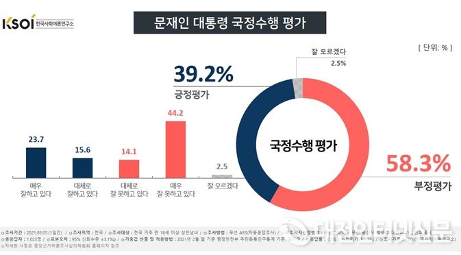 [대전인터넷신문=세종/박세종기자] TBS가 한국사회여론연구소에 의뢰한 3월 1주차 문재인 대통령의 국정수행 지지도는 긍정 평가 39.2%, 부정 평가 58.3%로 조사돼 차이가 19.1%p로 벌어졌다. 지난 2월 4주차 조사결과와 비교하면 긍정평가(43.4%→39.2%, 4.2%p)는 줄었고, 부정평가(53.2%→58.3%, 5.1%p)는 늘었다.
