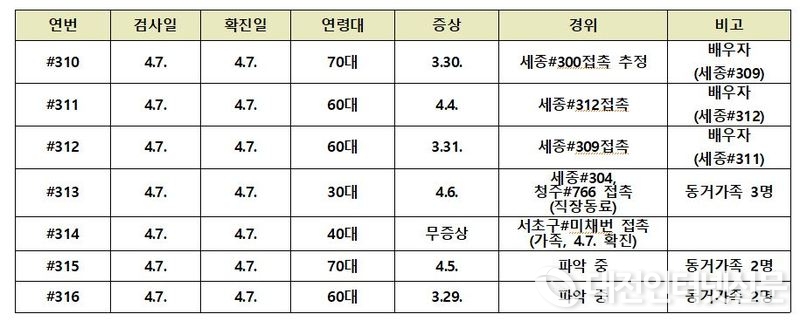 이로써 세종시는 4월 8일 오전 10시 기준 신규확진자 7명, 누적확진자 316명, 치료중 65명, 백신접종 4,161명, 자가격리자 1,338명, 사망자 1명으로 나타났다.