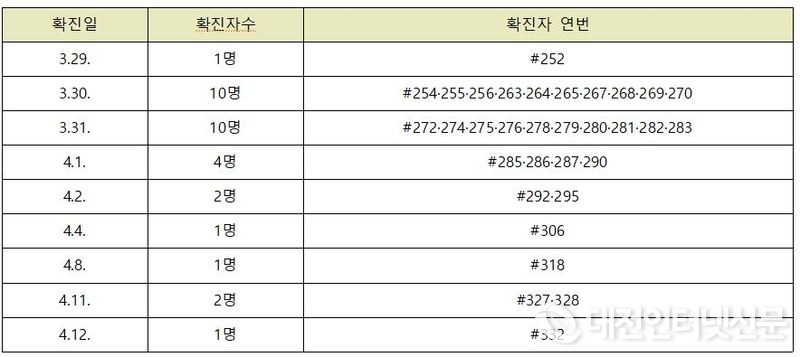 신규확진자 세종 332번(10대 미만)은 종촌초 관련자이며 세종 252번의 가족으로 자가격리해제 전 검사를 받아 4월 12일 확진 판정을 받았다. 세종 333번(10대)은 안동 226번과의 접촉으로 감염이 추정되며 무증상인 가운데 검사결과 4월 12일 확진 판정을 받았다.