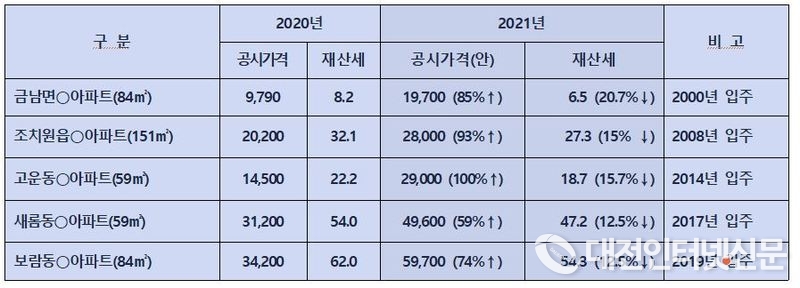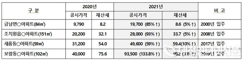 예를 들어 보람동 호려울마을 7단지 전용면적 102㎡ 아파트 1채를 보유한 경우, 공시가격이 지난해 4억 원에서 올해는 9억3,000만 원이 되어(전년대비 134%↑) 종합부동산세 납부 대상이 되었다. 이 경우, 작년에 76만 원이었던 재산세가 올해 98만 원으로 늘어나고, 종부세까지 합쳐서 120만 원 정도의 세부담이 예상된다.