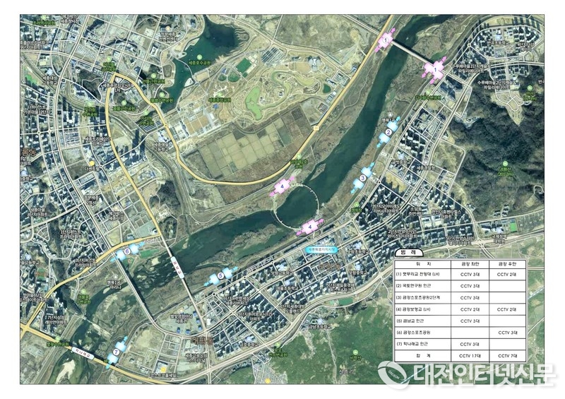 이에 따라 국토연구원 구간에는 고정형 CCTV 2대(상·하류 관제), 회전형 CCTV 1대, 금남교 인근에 고정형 CCTV 2대(상·하류 관제), 회전형 CCTV 1대, 금강스포츠 공원(1단계)에 고정형 CCTV 2대(상·하류 관제), 회전형 CCTV 1대, 금강스포츠공원(2단계) CCTV 2대(상·하류 관제), 회전형 CCTV 1대, 학나래교에 고정형 CCTV 2대(상·하류 관제), 회전형 CCTV 1대, 햇무리교 전망대 좌완 우완에 고정형 CCTV 5대(상·하류 및 하부 관제), 금강 보행교 좌안, 우안에 각 고정형 CCTV 2대(상·하류 관제) 등 총 24대가 설치될 계획이다.