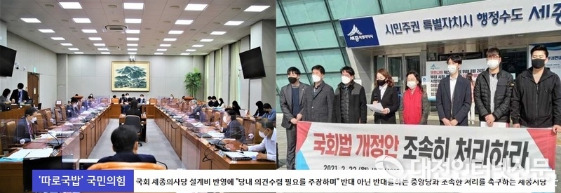 국민의힘 중앙당은 법률 검토와 당내 의견수렴 시간이 필요하다는 이유로 국회법 개정안 처리를 무산 시키고 세종시당은 국회법 조속 처리를 촉구하는 모습. [사진-대전인터넷신문자료]