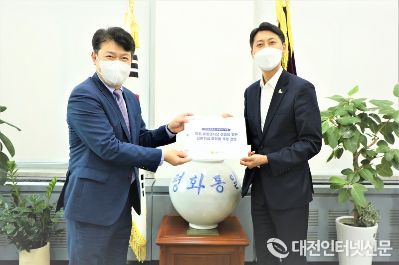 이태환 의장이 1인 시위를 마친 후 이동학 더불어민주당 청년 최고위원과 만나 국회 세종의사당 설치의 필요성과 당위성에 대한 세종시의 입장을 전달 했다. (사진-세종시의회)