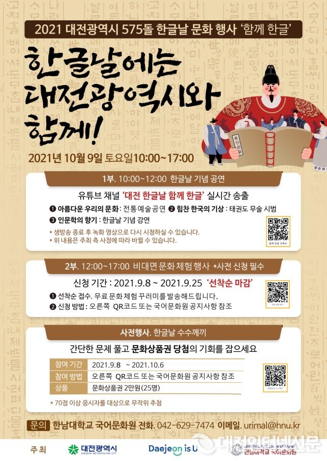 대전시가 주최하고 한남대학교 국어문화원이 주관하는 이번 한글날 기념 문화행사는 코로나19의 확산 방지를 위해 비대면으로 개최되며, 사전행사, 1부(공연 및 특강)와 2부(문화체험행사)로 진행된다.