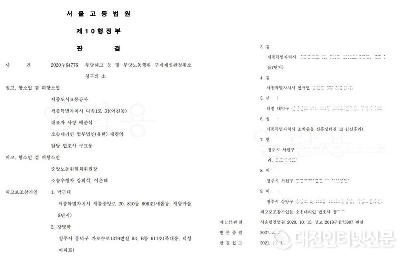 세종도시교통공사는 충남지방 노동위원회(이하 지노위)의 재량권을 일탈·남용한 부당노동행위라는 판정에도 불구하고 대형 로펌을 동원, 이행강제금과 소송비용 등 현재까지 추산 가액 2억 원에 이 넘는 시민 혈세를 투입, 항소했지만 법원은 이를 기각하면서 노조와 지노위의 손을 들어줬다.