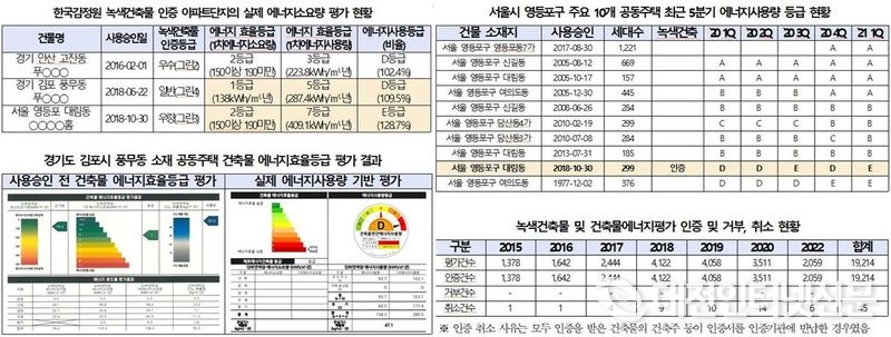 반면 지난 2011년 경기도 김포시 장기동에 건설된 공동주택과 지난 2017년 김포시 마산동에 건설된 공동주택은 녹색 건축 인증을 받지 않았음에도 불구하고 작년 1분기부터 올해 1분기까지 5분기 연속 에너지사용량 평가에서 B등급을 받았다. 즉, 녹색 건축 인증을 받은 공동주택이 녹색 건축 인증을 받지 않은 공동주택보다 에너지사용량이 더 많았다.
