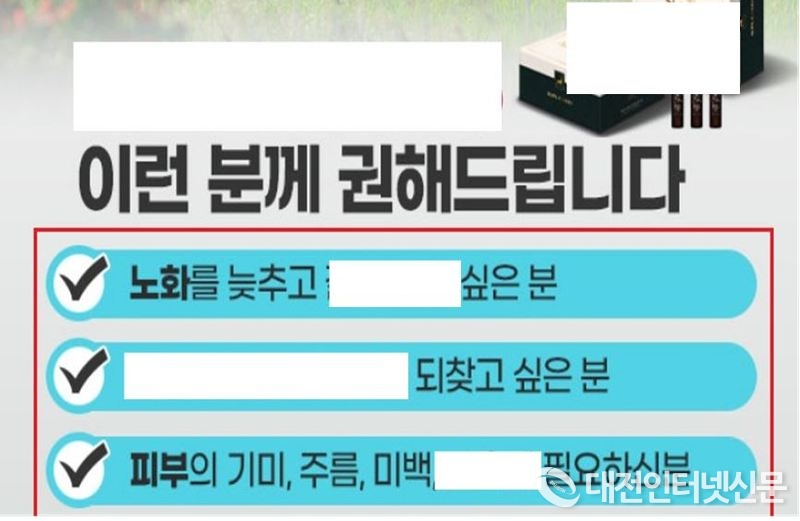 기타가공품을 ‘면역력, 혈액순환 하루 한 알로 완벽 케어해보세요’ 등으로 광고해 일반 식품을 건강기능식품으로 오인‧혼동하게 만드는 광고, ‘혈액순환 효과 보고 있어요...어머니가 혈액순환이 되는지 몸이 따듯해지는 것 같다고 하세요’ 등의 표현으로 일반 식품(기타가공품 등)에 대한 체험기를 이용하여 소비자를 현혹하는 광고, 기타가공품에 ‘노화를 늦추고 싶은 분, 피부의 기미 주름, 미백이 필요하신 분’ 등의 표현으로 신체조직의 기능·작용·효과·효능이 있다고 광고하는 등 부당 광고가를 적발했다고 관계자는 설명했다.