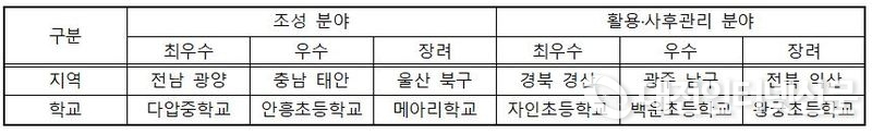 활용·사후관리 분야에서는 적절한 수목 관리와 교육과정과 연계된 다양한 프로그램을 구성·운영하고 있다는 점이 높게 평가됐다.
