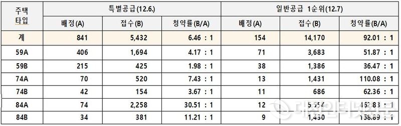 무주택 실수요자의 관심을 모았던 일반공급 최고 경쟁률(84A타입)은 462.83:1이며, 전 타입 1순위 조기 마감되어 일반공급 2순위는 접수받지 않는다.