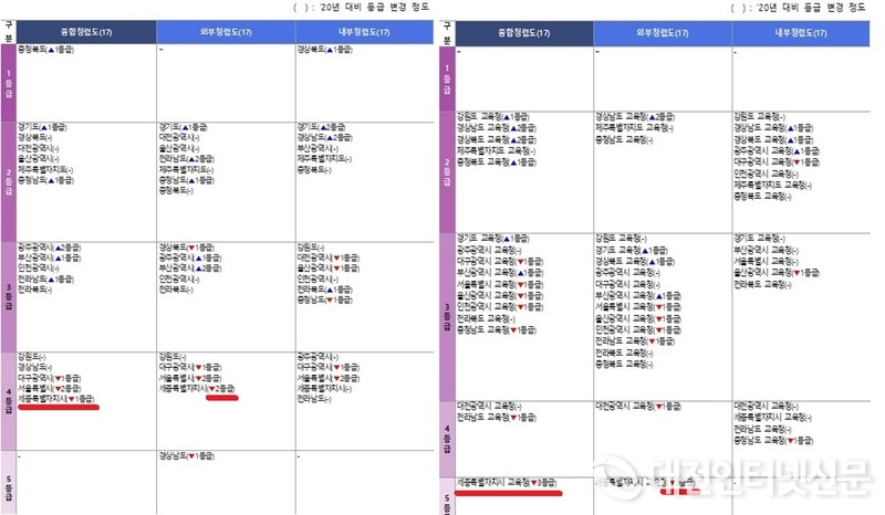 한편 세종 시는 전년 3등급에서 1등급 하락한 4등급으로 경상남도 5등급을 제외하면 사실상 최하위나 마찬가지로 국토 균형발전을 선도하고 명실상부한 행정도시로서의 위상이 추락하고 있어 세종시의 대책 마련이 시급한 것으로 보인다.