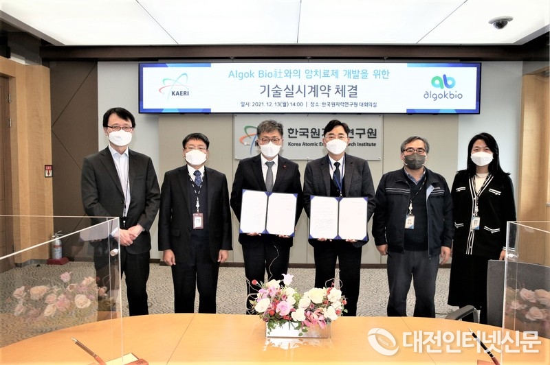 한국원자력연구원-알곡바이오 기술실시계약 체결식 기념사진, (왼쪽 세 번째부터) 박원석 한국원자력연구원장, 김성철 알곡바이오 대표, 김인규 책임연구원. [사진-한국원자력연구원 제공]