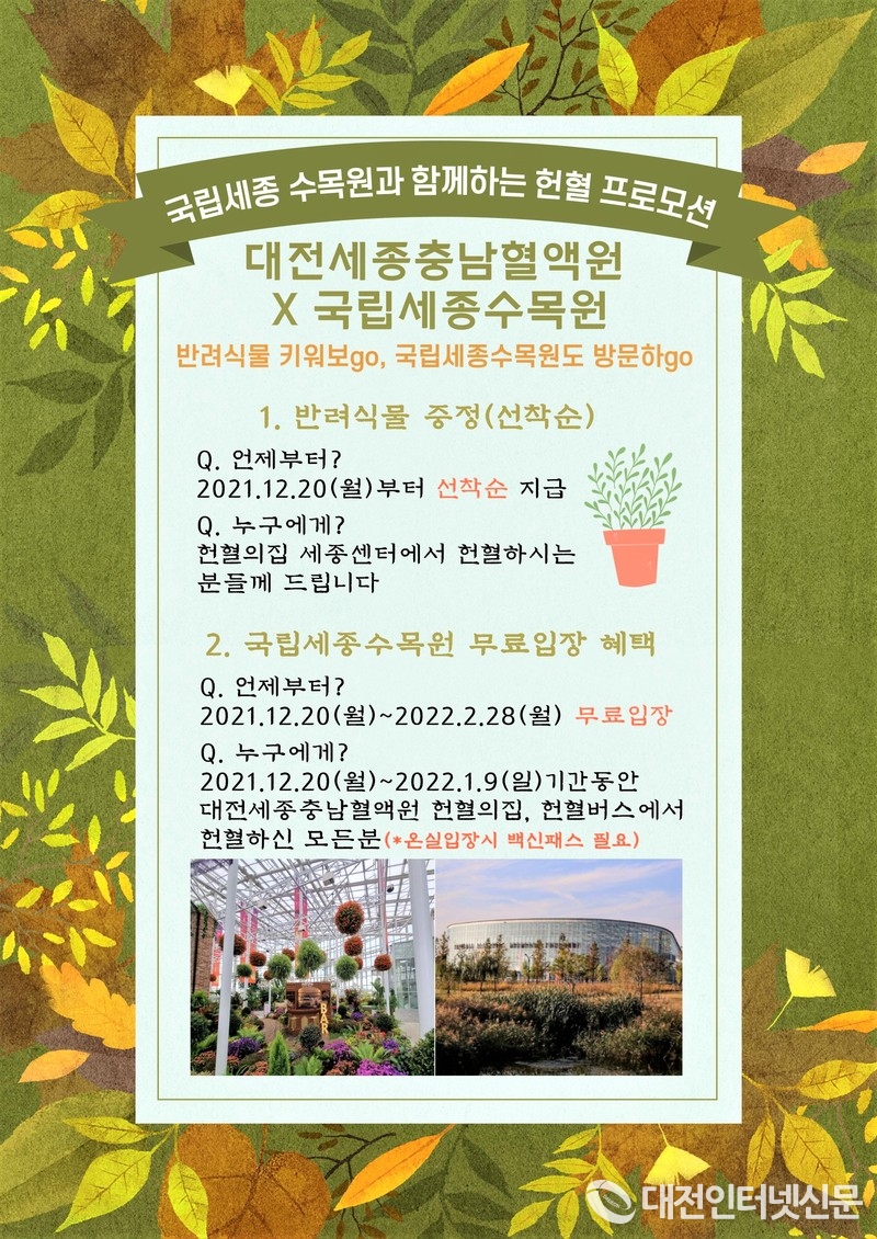 국립세종수목원은 코로나19 여파로 실내활동이 늘어나며 혈액 수급량이 감소하고 국민의 우울감이 증가하는 만큼 이번 사회공헌 협약을 계기로 생명 나눔(혈액·식물)을 위해 상호 협력할 계획이라고 설명하며 이 달 20일부터 22년 1월 9일까지 대전·세종·충남혈액원 관할센터에서 헌혈한 사람을 대상으로 국립세종수목원 무료 관람 혜택을 제공하고(헌혈증과 신분증 지참), 헌혈의집 세종센터에서 선착순으로 반려식물을 나누어준다.