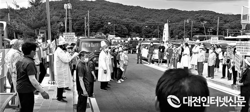 지난 7월 20일 송성리 주민 간담회 장 입구를 점령하고 이춘희 시장 간담회 장 출입을 저지하는 반대대책위. [사진-대전인터넷신문]