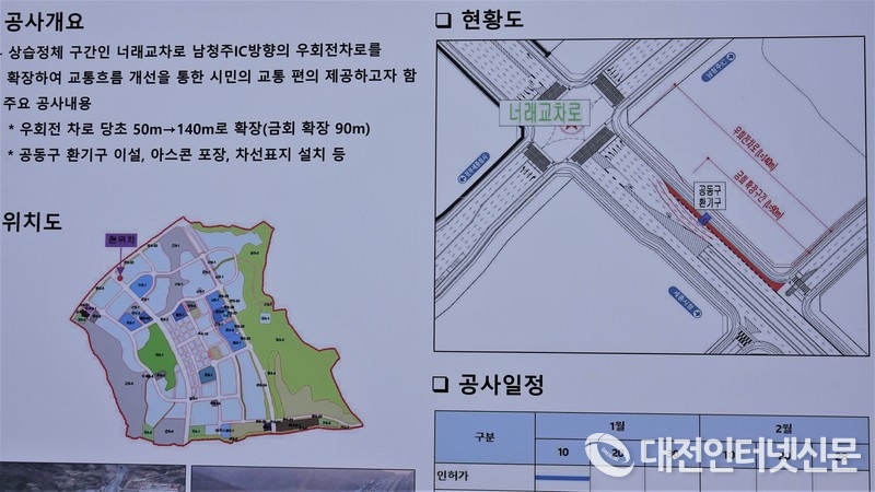 너래교차로 확장공사는 그동안 직진과 우회전 차량의 상습 정체 구간으로 부강면, 남청주 나들목 방향의 우회전 차로를 확장, 차량흐름 개선을 통해 시민 교통편의를 제공하기 위해 우회전 대기차로 90M를 확장하는 공사로 2월 준공할 예정이다.