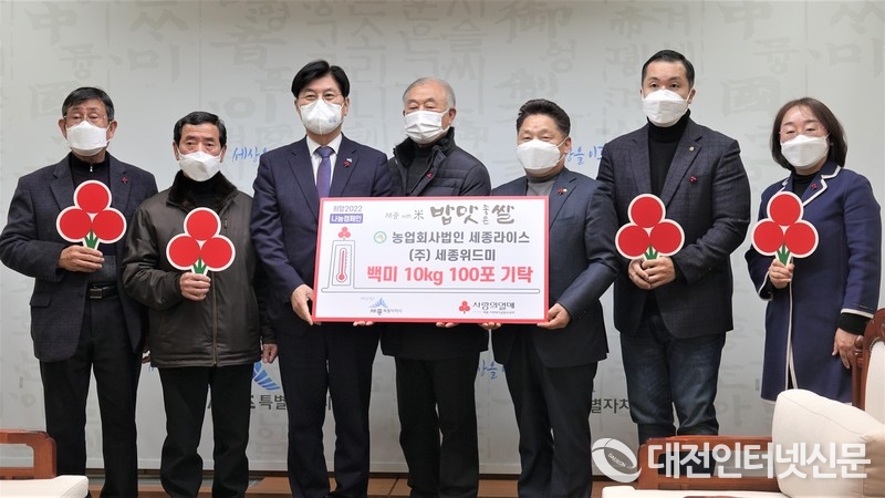 농업회사법인 세종 라이스와 ㈜세종위드미도 백미(10㎏) 100포를 기탁, 이는 지난해 전국 고품질 쌀 생산 우수 전업농 선발대회에서 대통령상을 받은 배경진 씨가 생산한 쌀이다.