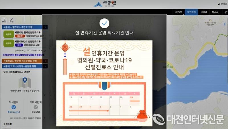 [대전인터넷신문=세종/권혁선 기자] 세종시가 설 명절 기간 중 ‘세종엔’을 통해 비상 의료기관 및 코로나 19 선별진료소 정보표출 서비스를 제공한다.