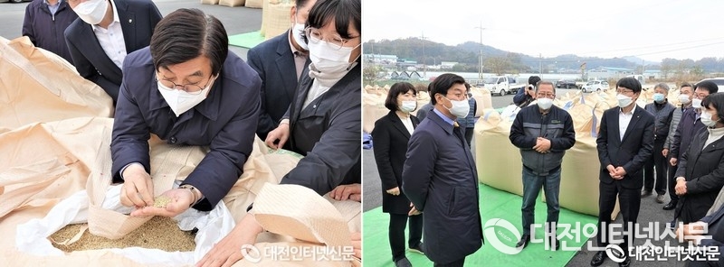 벼 수매 현장을 찾은 이춘희 세종시장이 관계자들을 격려하고 농민들의 열정이 묻은 쌀 값 안정에 최선을 다할 것을 박종설 세종RPC 대표에게 당부하는 모습. [사진-대전인터넷신문]