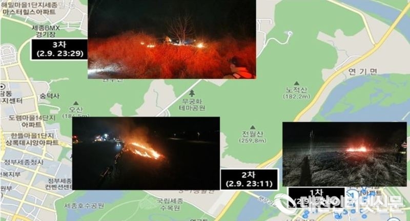 2월 9일 금강수변에서 발생한 연쇄들불 방화범으로 중학교 현직 교사가 검거됐다.[사진-세종소방본부]