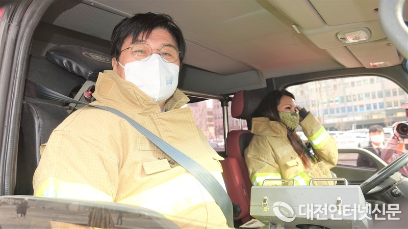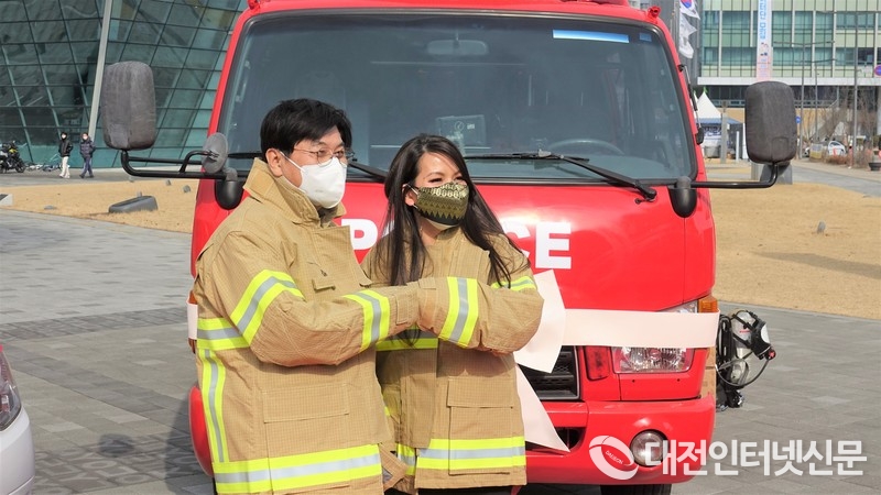 소방복을 착용하고 기념촬영하는 이 시장과 찌릉 보톰 랑세이 주한캄보디아대사. [사진-대전인터넷신문]